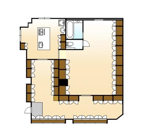 その丸い窓の前から入って来た扉を向いた感じでの部屋全景。