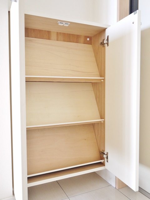玄関の下駄箱は、見やすく出しやすい斜めスタイル。
