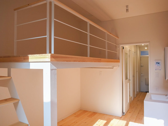 ロフトの上も下も、立てるほど高さはないんです。けどこの限られたスペースの中で、2つの空間を作れるってすごく魅力的だと思う。下にはソファ入れます。友達が来た時も、一緒にリラックスできるような場所にして。階段の下にもちょっとした荷物を置けそうだな。