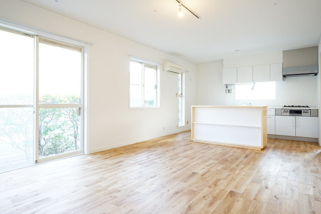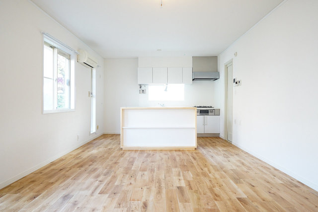 広さ15帖。場合によっては、このカウンターがあればダイニングテーブルは必要ないかもしれませんね。奥の空間には、大きなラグに、ソファを置こうかな。真っ白な壁を使って、プロジェクターで映画観れるかも。贅沢…。