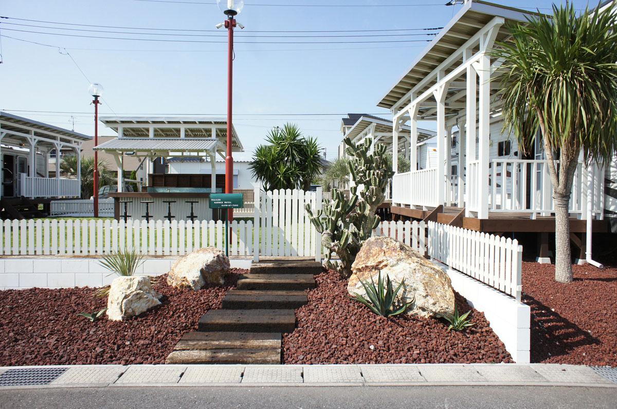 500㎡弱の広々とした土地に左右にそれぞれ2台ずつ、トレーラーハウスが縦列してあり、4台分の駐車場も完備。