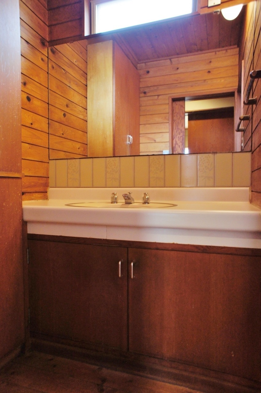 大きな鏡と上部に窓。