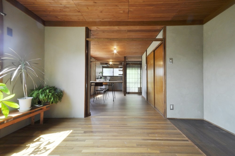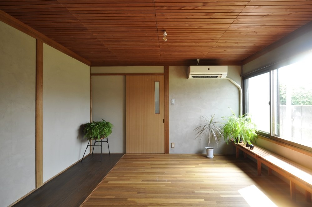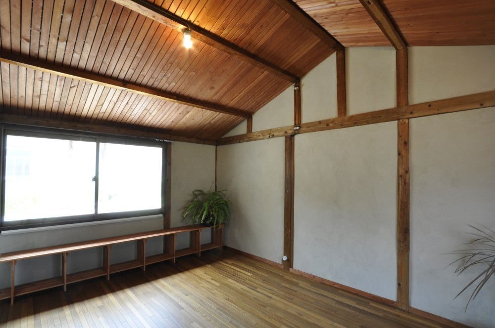 チークフローリングの床と漆喰の壁、