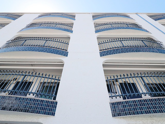 青空に映える白い壁と青いタイル、 曲線にせり出した柵。