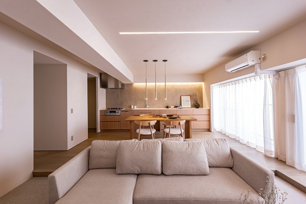 広いリビングに大きな窓。 ホテルのスイートルームのように上品で 居心地よさそうな、たたずまいは 見ているだけで心がほぐれます。 しっとり、くすみカラーでまとめられた 内装は、ジャパンディスタイルを 意識されたのだとか。 ジャパンディスタイル…とは? まだ耳に新しい、このキーワードと 共に、ルームツアーへと参りましょう。