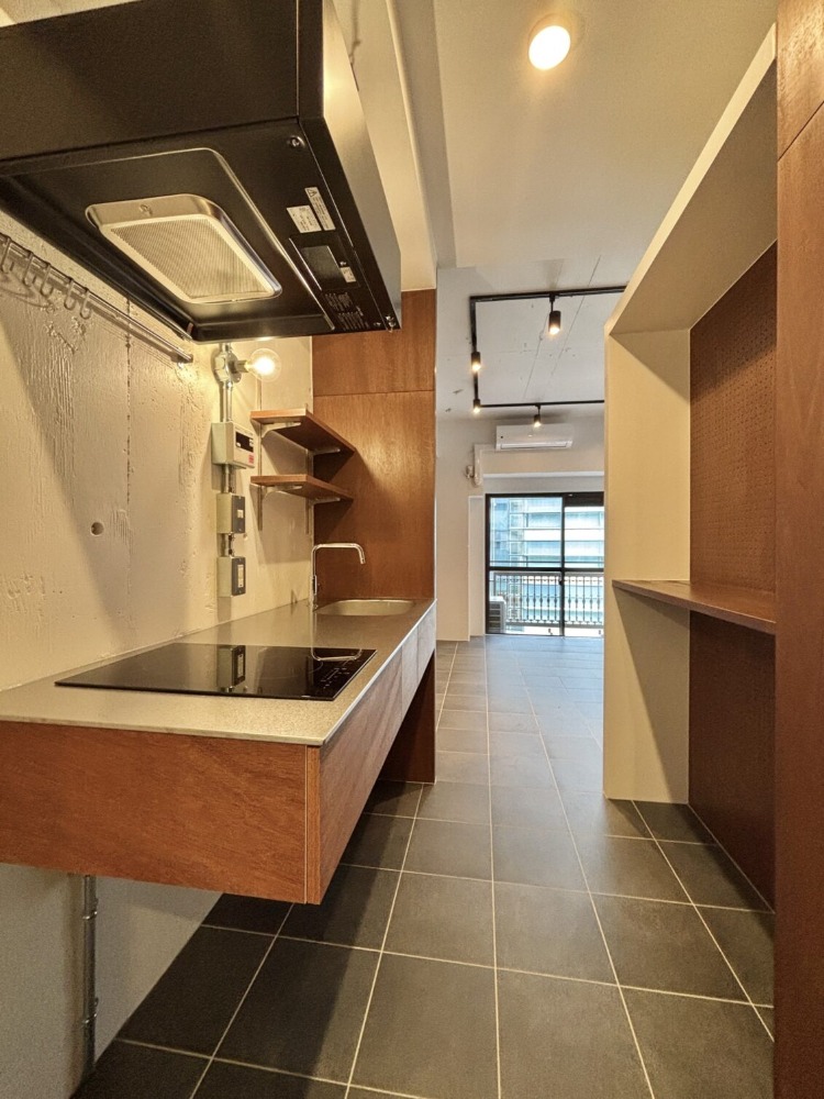 宙に浮いたようなデザインの スタイリッシュな造作キッチンも ばっちり居室に馴染んでいますね。