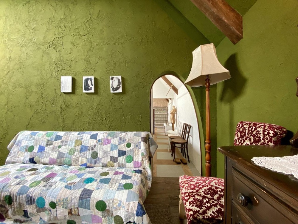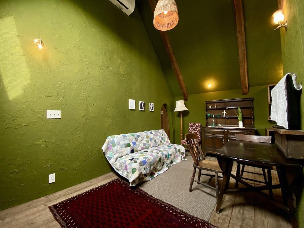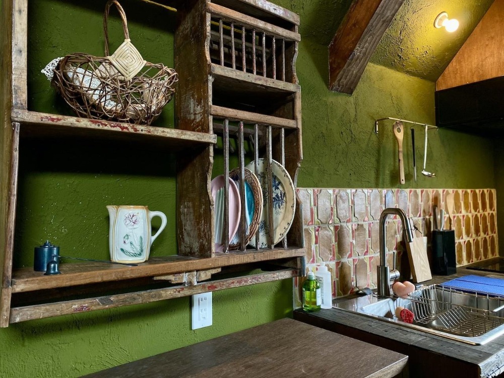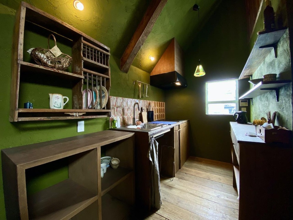 色鮮やかなモスグリーンの壁と