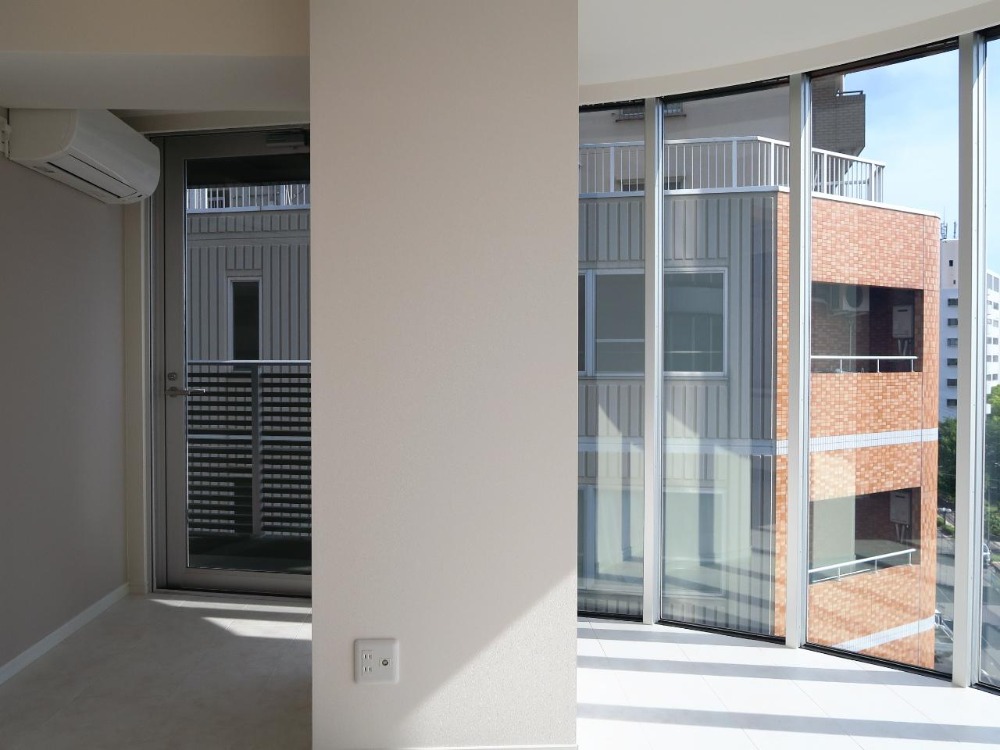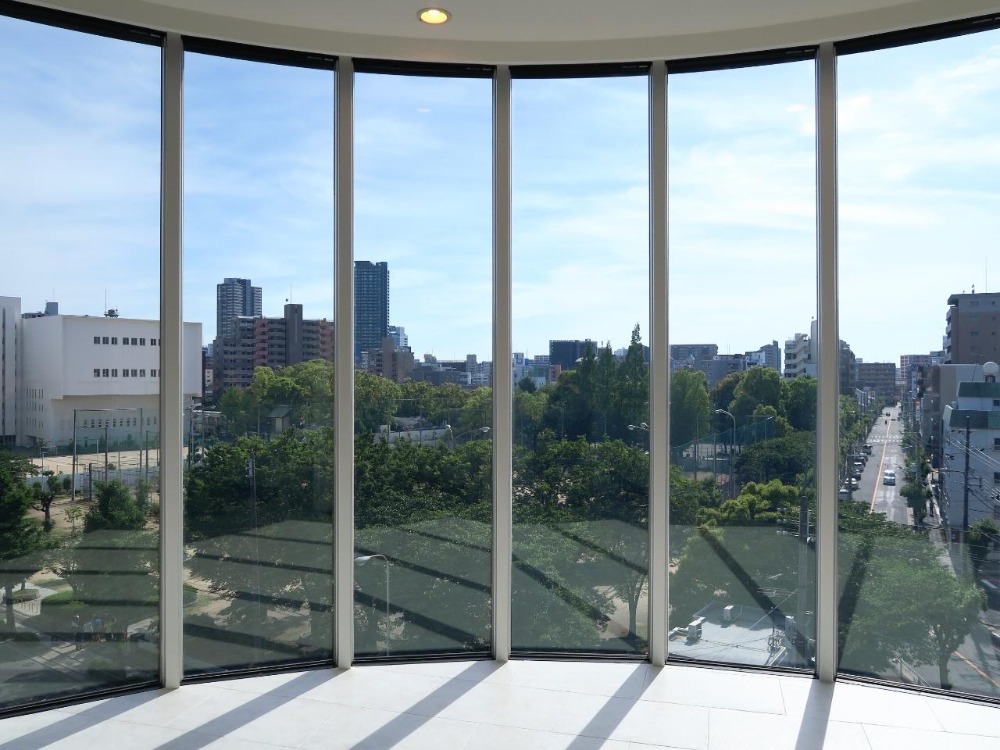 ドラマチックなボウウィンドウ越しに眺める、都心のオアシス (大阪市北区23㎡の賃貸物件)