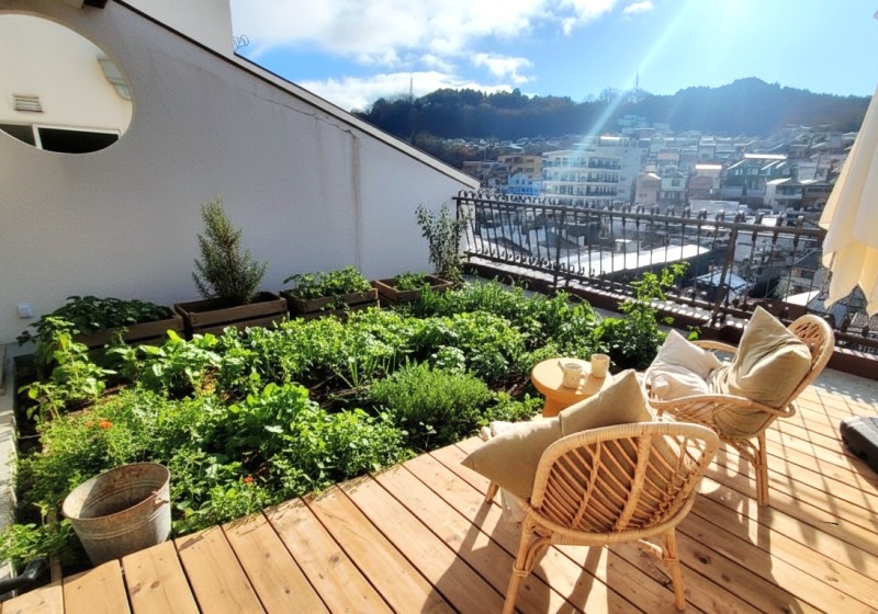 丁寧に育てた野菜や草花が 穏やかな陽に包まれ、 その向こうには、神戸の街の風景。