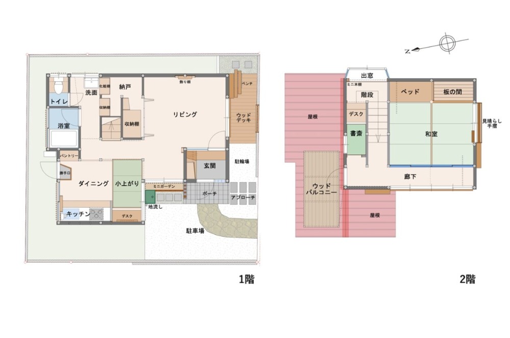 2階には和室とウッドバルコニーが
