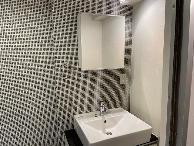 洗面所の壁にはモノトーンタイル。