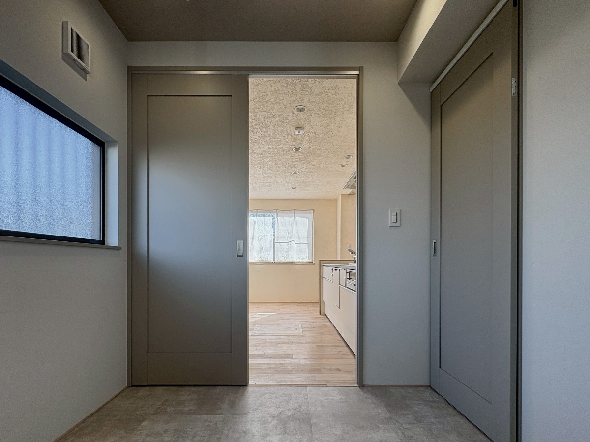 くすみカラーのドアの色も可愛い。