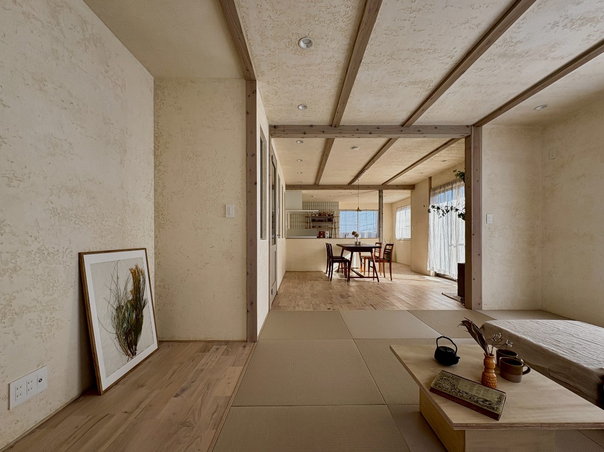無垢床のリビングから、琉球畳を敷いた