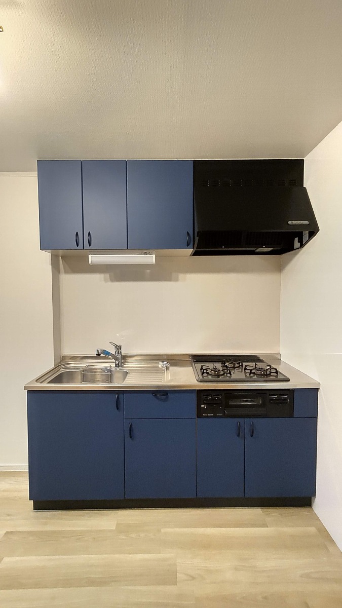 キッチンのコバルトブルーと白い壁に