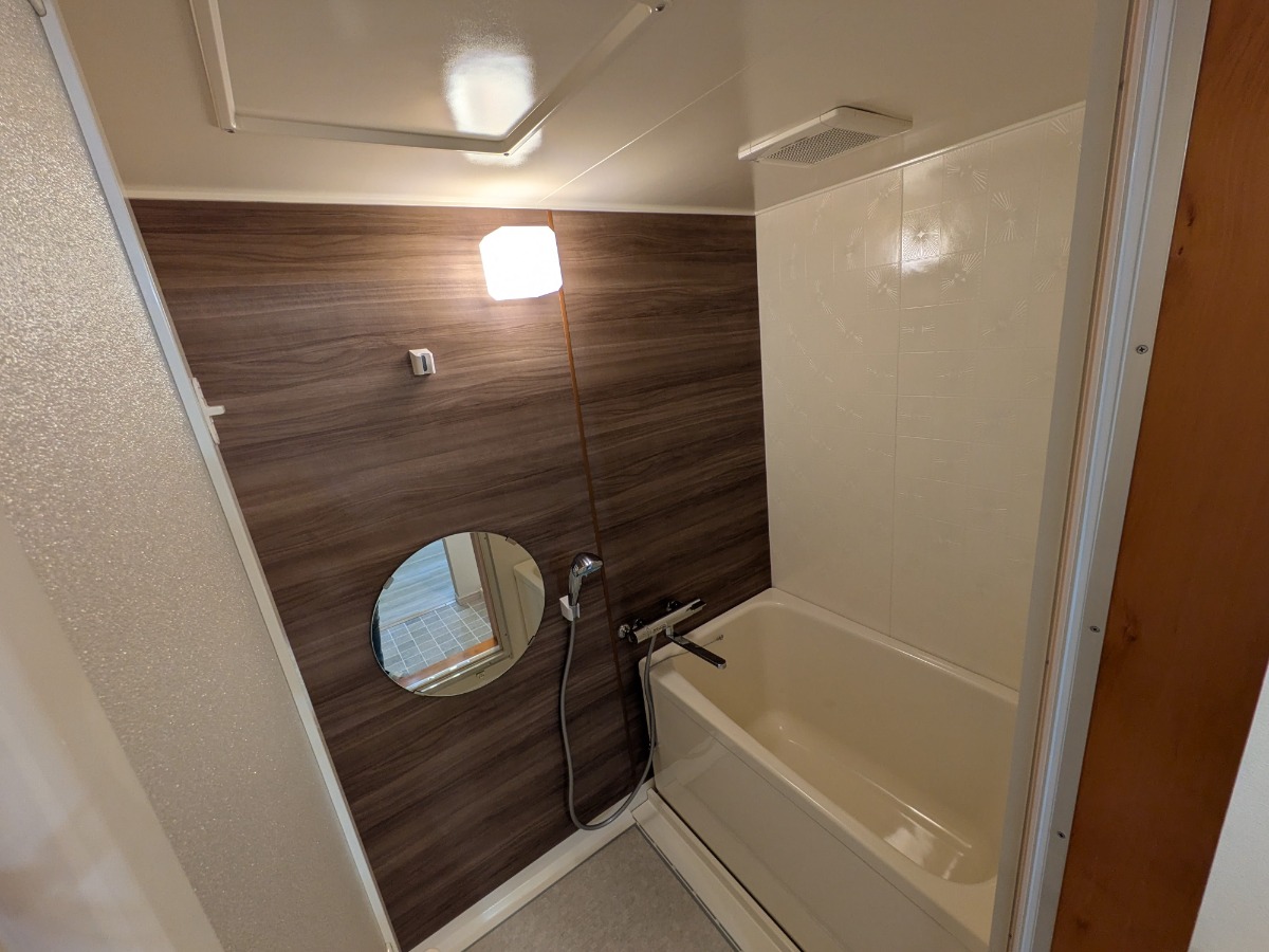 奥にはまあるいミラーのバスルーム。