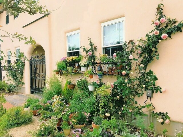 表情豊かな塗り壁をつたうピンクの蔓薔薇、