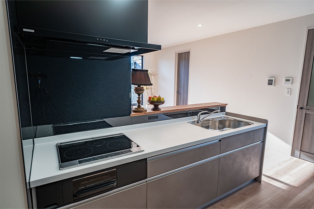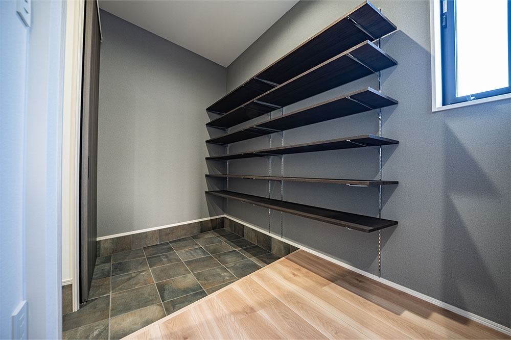 その奥に見えるのはパントリー。 稼働棚が付いていて、 ロボット掃除機にも対応しています。 この広さなら、ロボット掃除機も 活躍してくれそうですね。