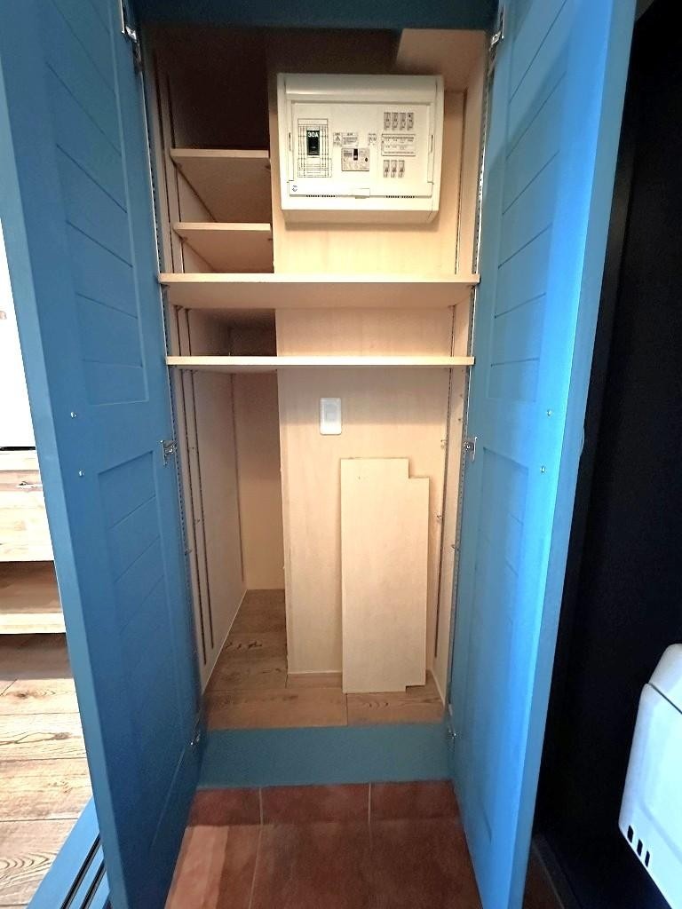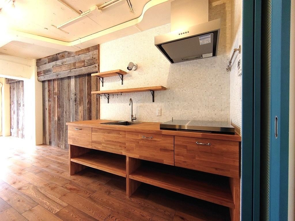白に塗装した壁、高い天井、 幅広の無垢フローリングを敷いた床。 その床と同じ色味の、 家具のような造作キッチン。 ブルーの枠がアクセントになった 室内扉にはチェッカーガラスが はめこまれています。