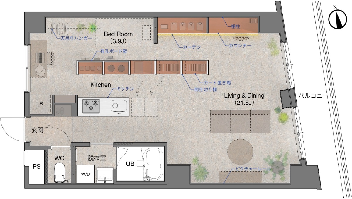 空間がゆるやかにゾーニングされています。