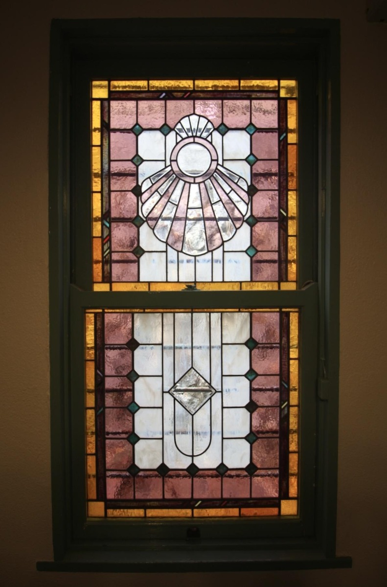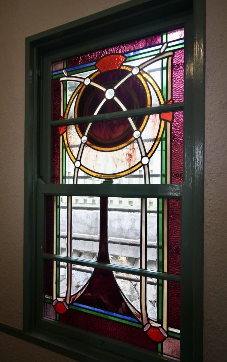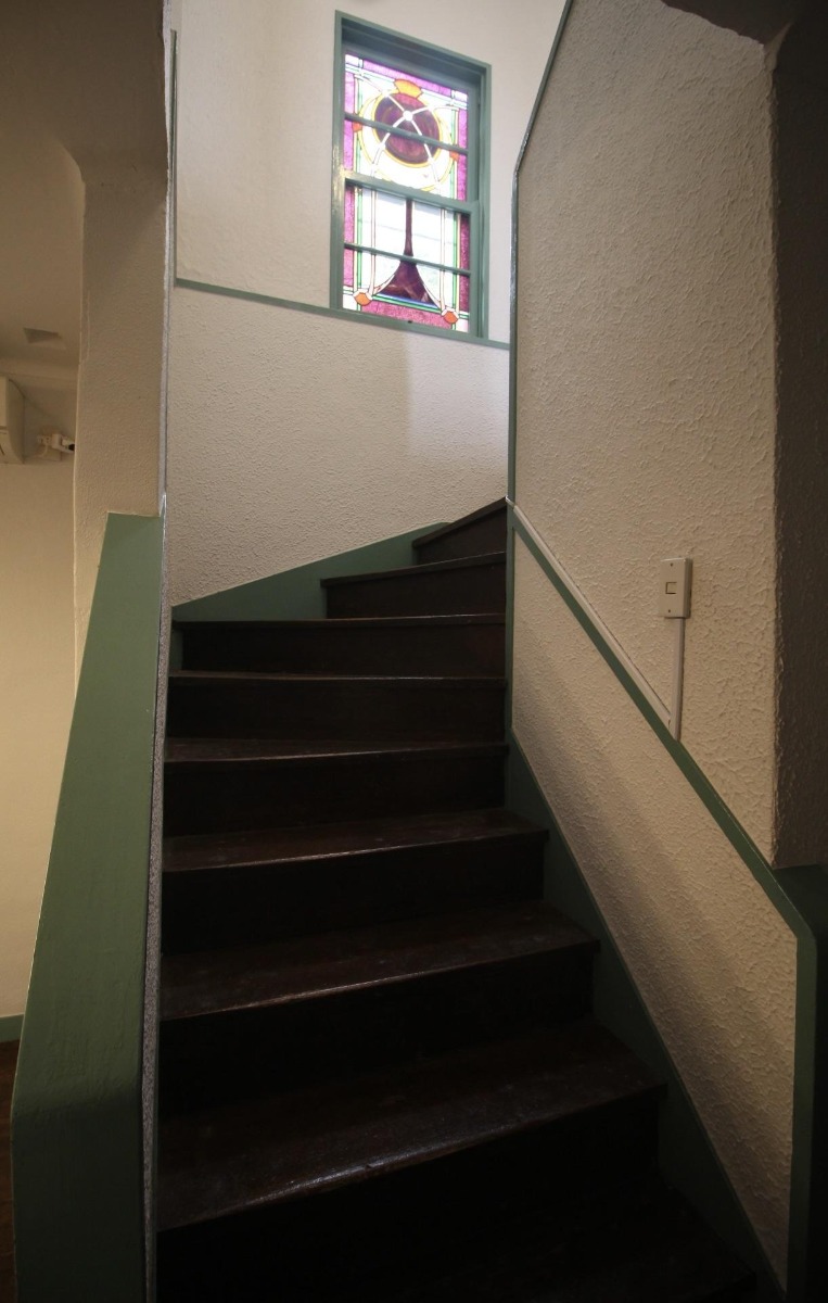 アールを描く壁面に ステンドグラスの窓が はめ込まれています。