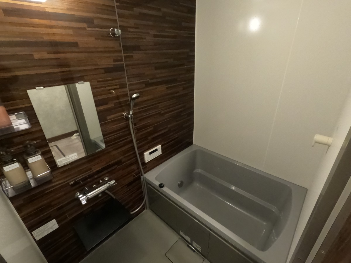お風呂はグレーの浴槽に木目柄の壁。