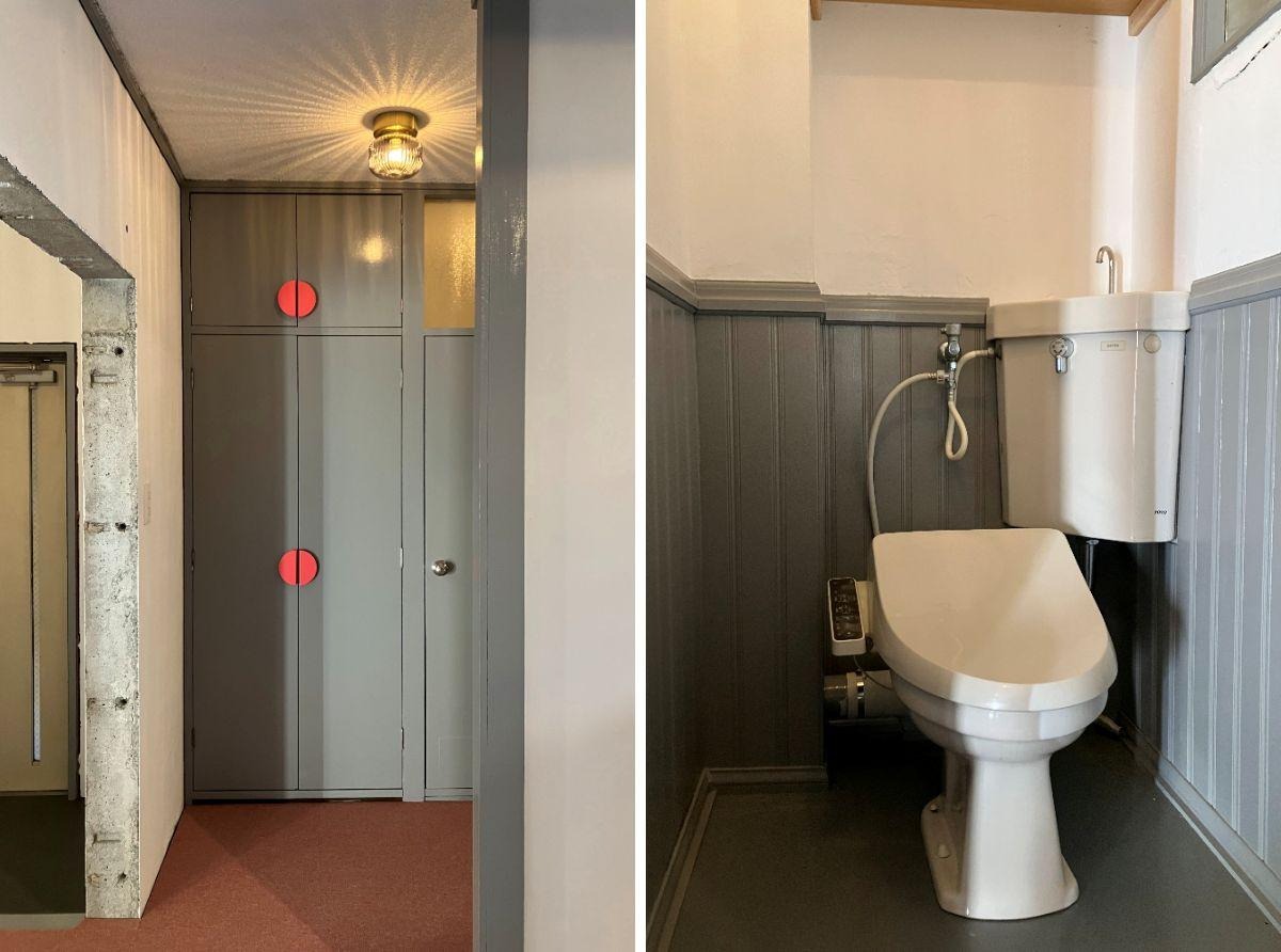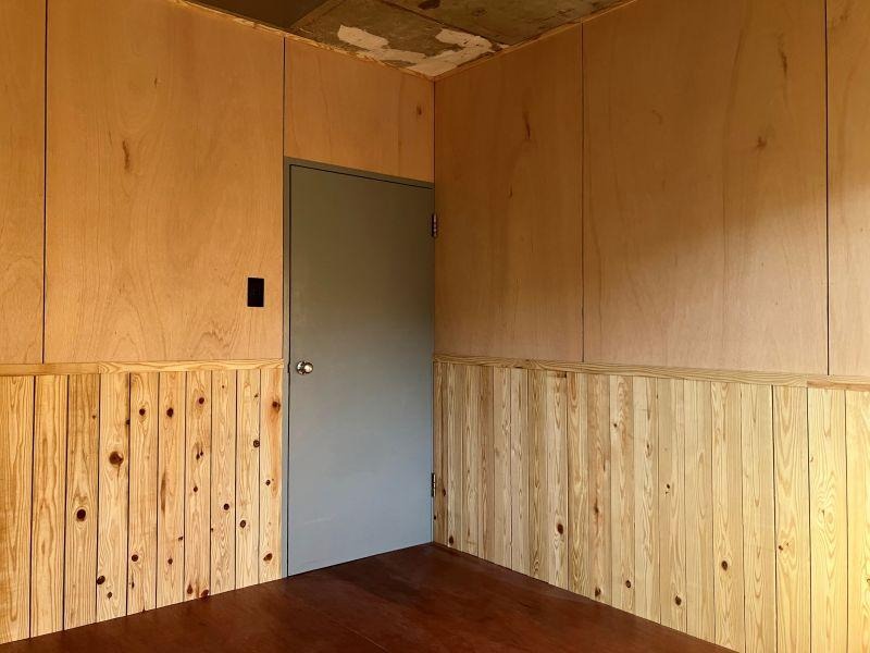 腰までは杉板貼り、壁と床は合板仕上げ。