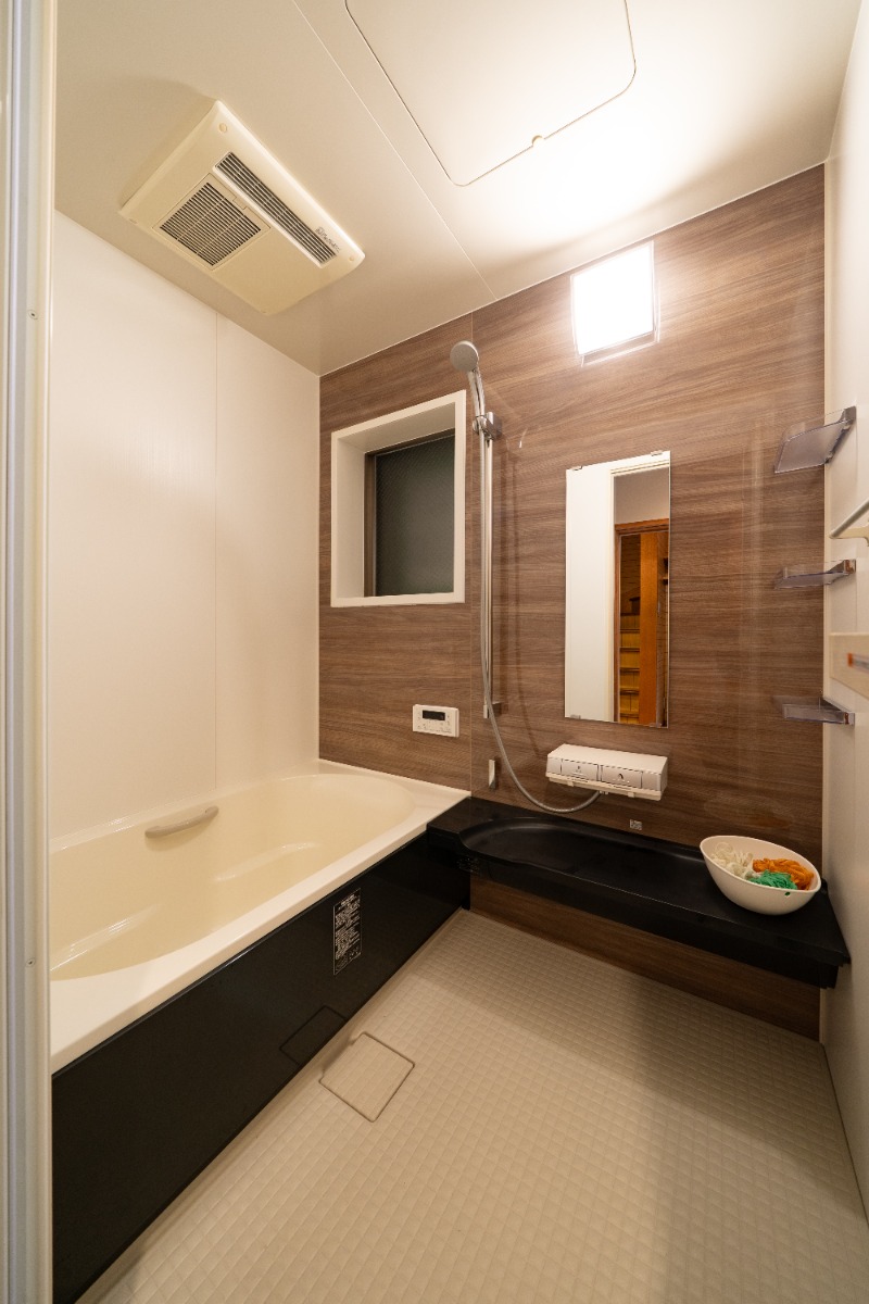 浴室は木目調のアクセント壁で