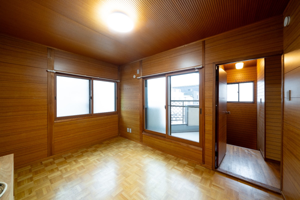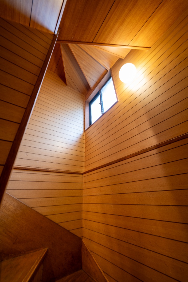 丁寧に貼られた合板張りの壁。