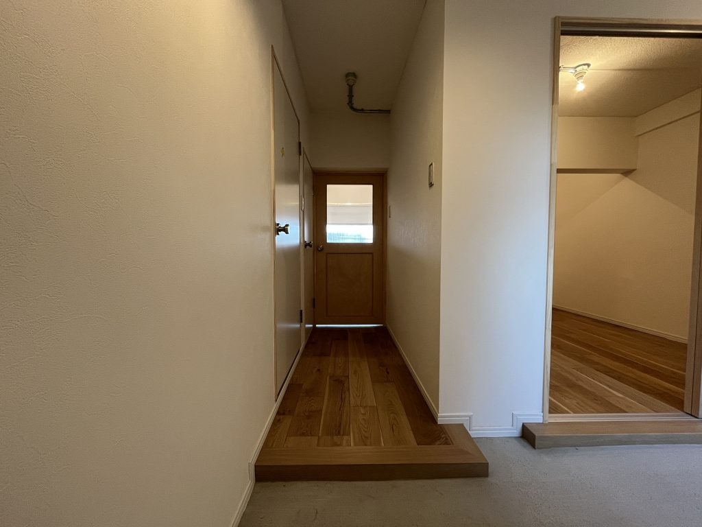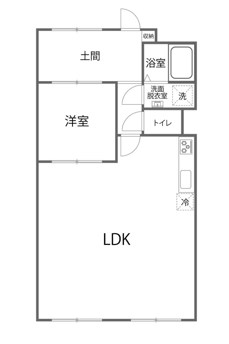 玄関 → 土間 → 洋室 → LDK と まっすぐ抜けるルートと、 洋室を通らずにLDKへ入るルート。