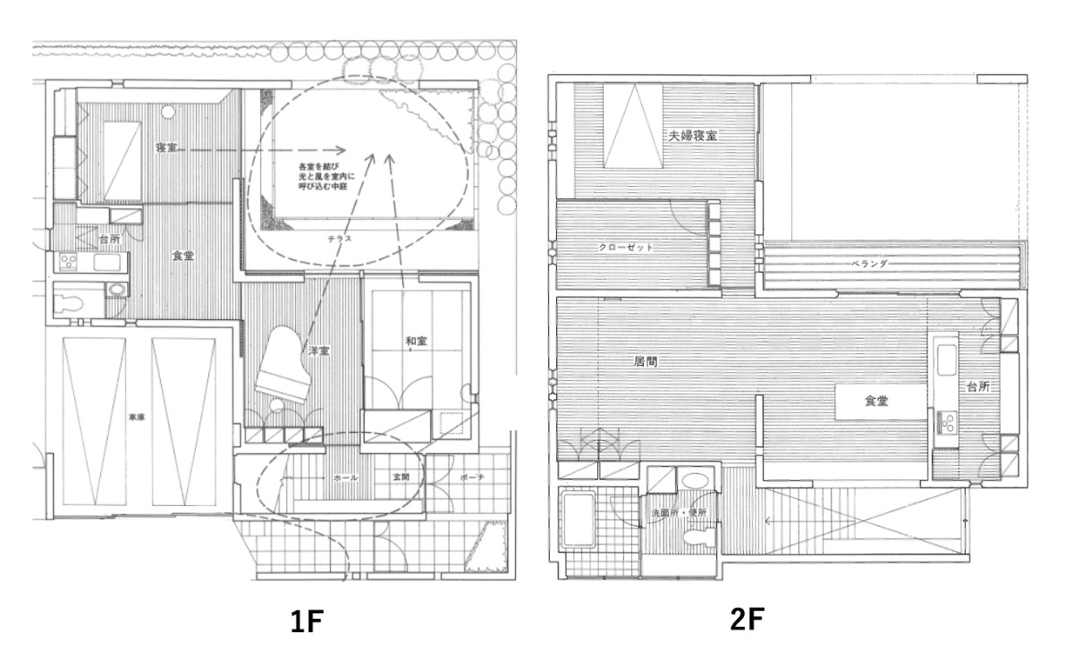 中庭から取り込まれる光と景色が、