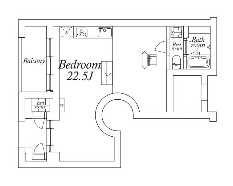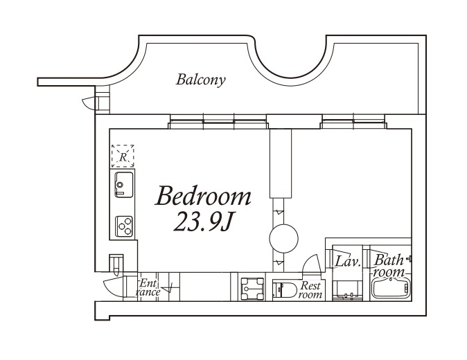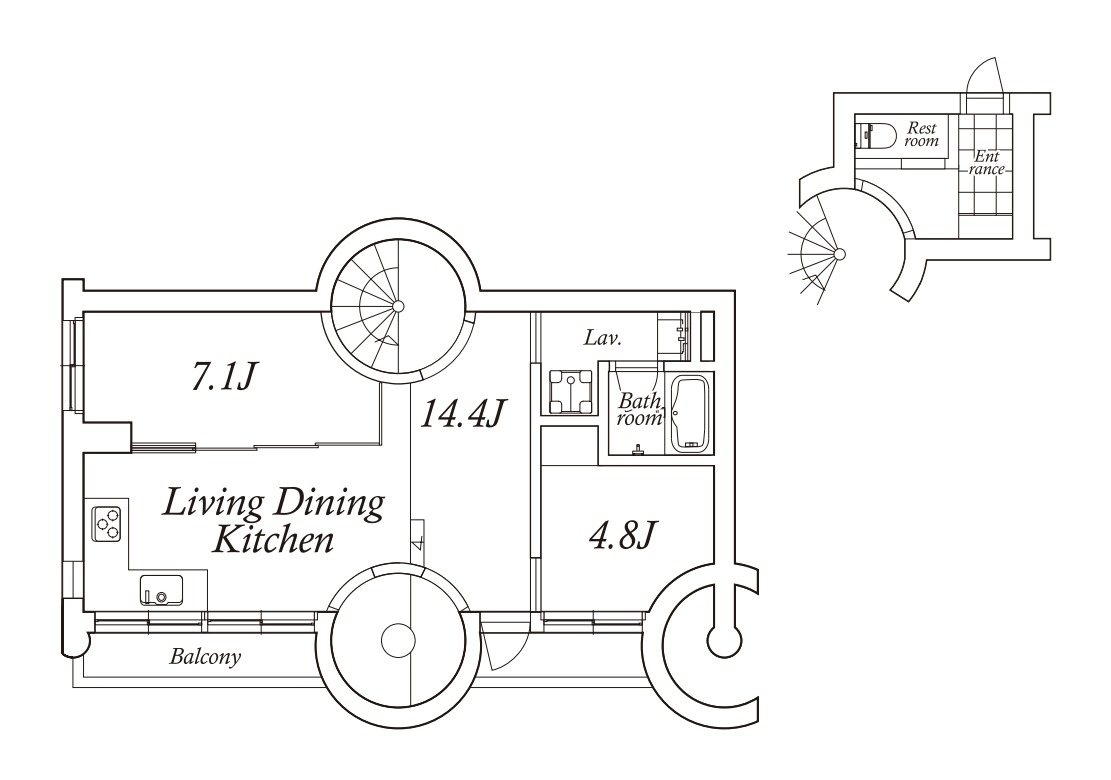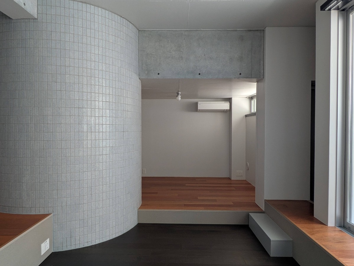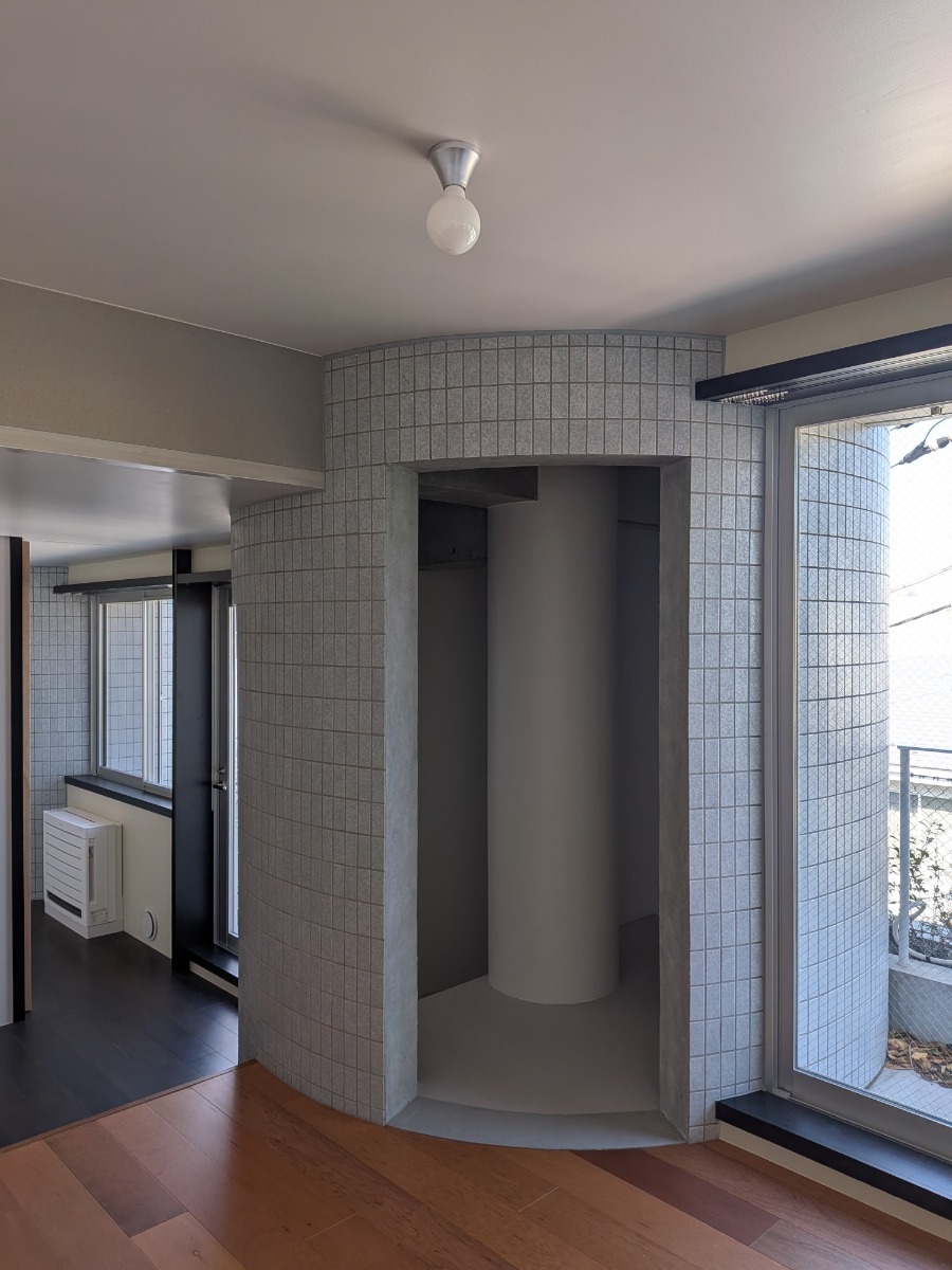 アールを描くタイル張りの壁に、