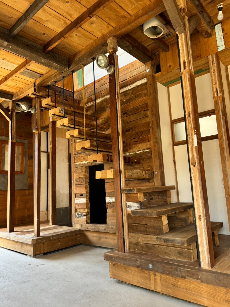 力強い構造の骨組みと木材の温かみが